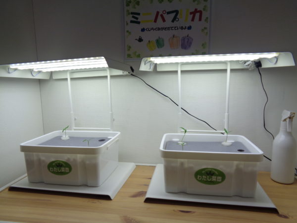 種を植えてくじら組の保育室でお世話をしていたのですが、ちいさなかわいい芽が出てきたのでLED照明の下に移動させました!
